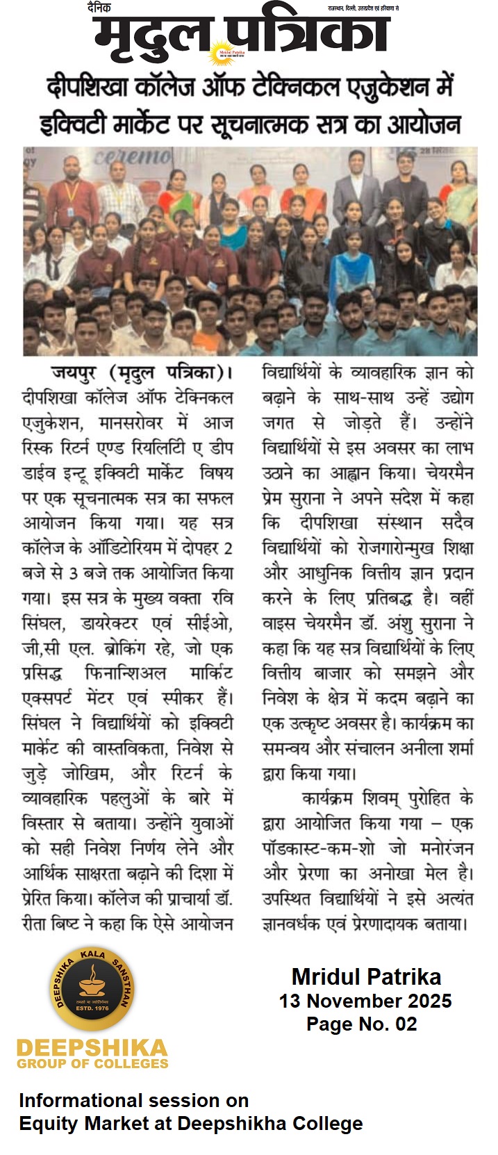 Press Media Coverage- Informational session on Equity Market at Deepshikha College