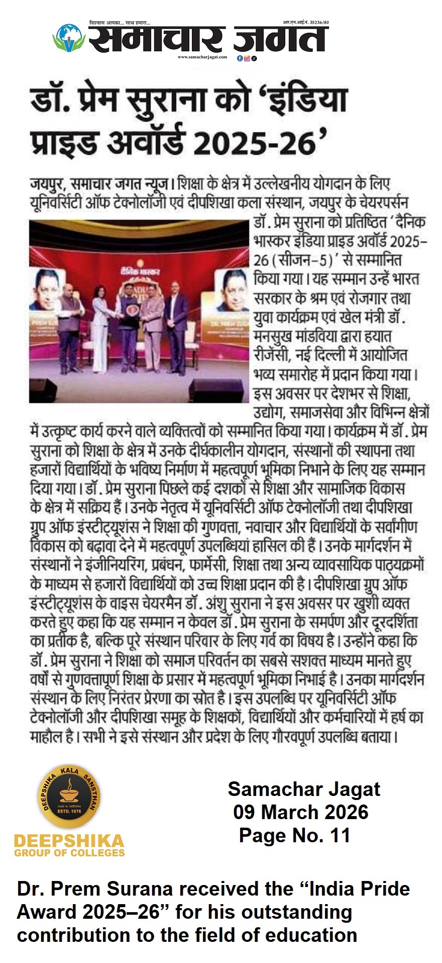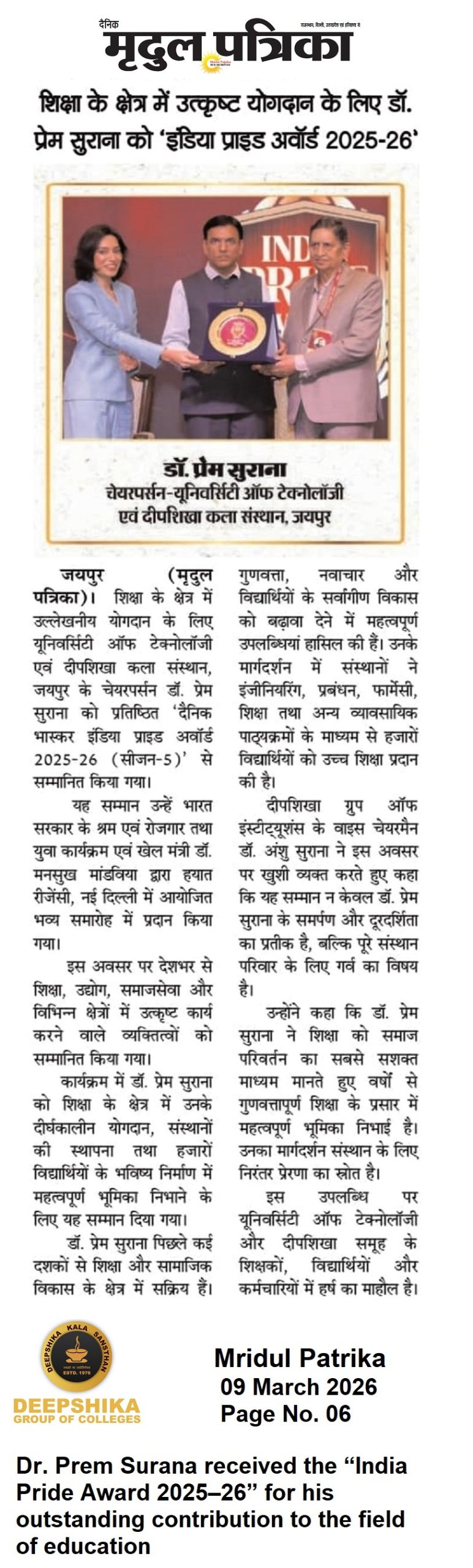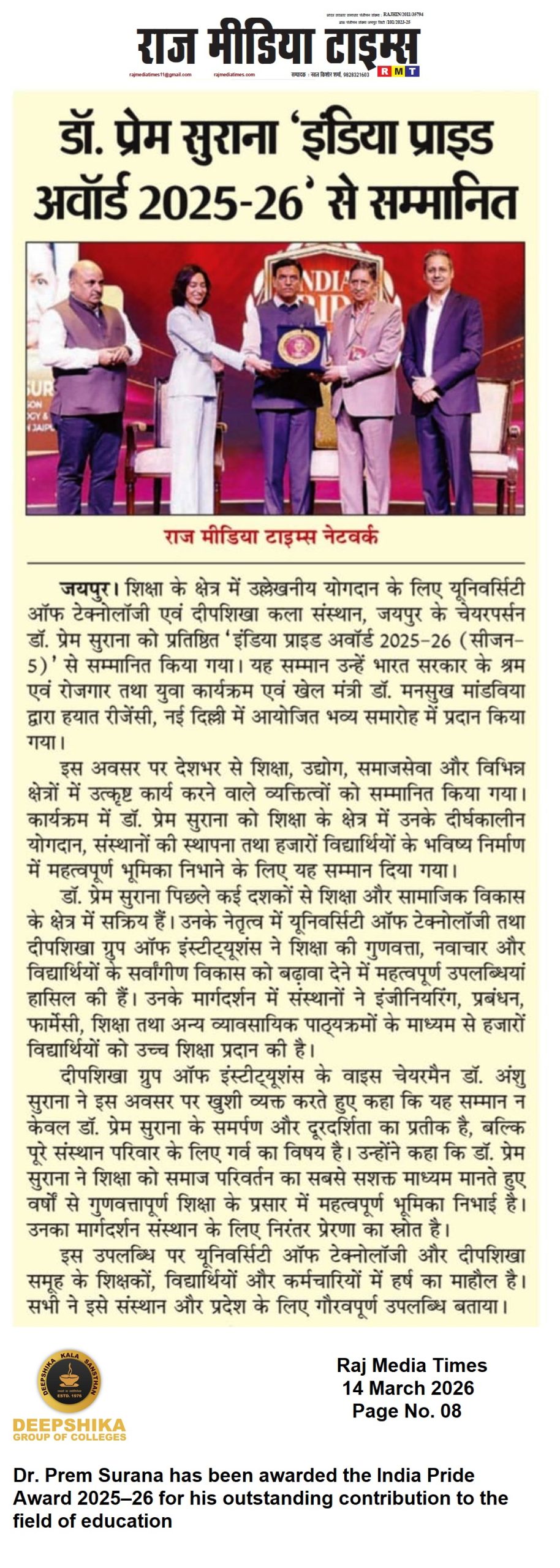 Press Media- Dr. Prem Surana has been awarded the India Pride Award 2025–26